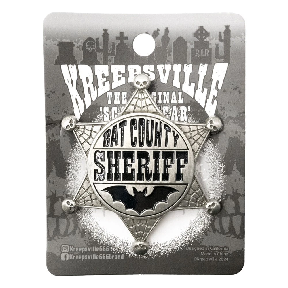 Step aside, lawmen of yore—it’s time for the gothic western law to take charge! The Bat County Sheriff Badge enamel pin features a traditional sheriff badge shape with skull-tipped points, intricate web engravings, and enamel text. Crafted with high quality and durable metal and a secure pin backing that locks so you won’t loose it on your next graveyard patrol. Pin is approx. 2.5″ (6.35cm) H x 2.25″ (5.72cm) W. Designed in California.