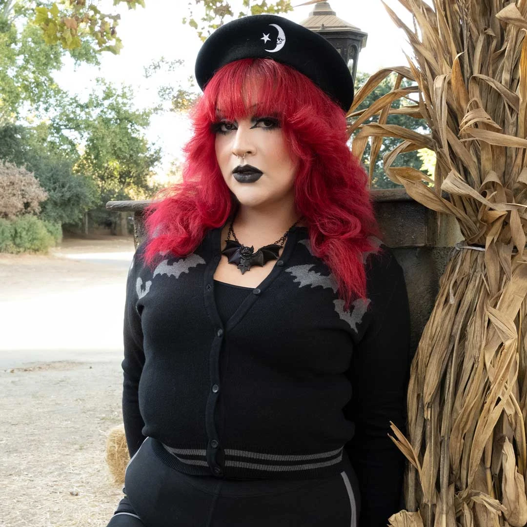 This button down Bat Flock Grey Cardigan by Kreepsville is a fangtastic addition to your spooky wardrobe! Featuring grey knit spooky bat designs on the front and back and contrast stripe detail on hem and cuff for a vamp look that will creep you warm. Made of 100% cotton for a comfortable fit. Designed in California.