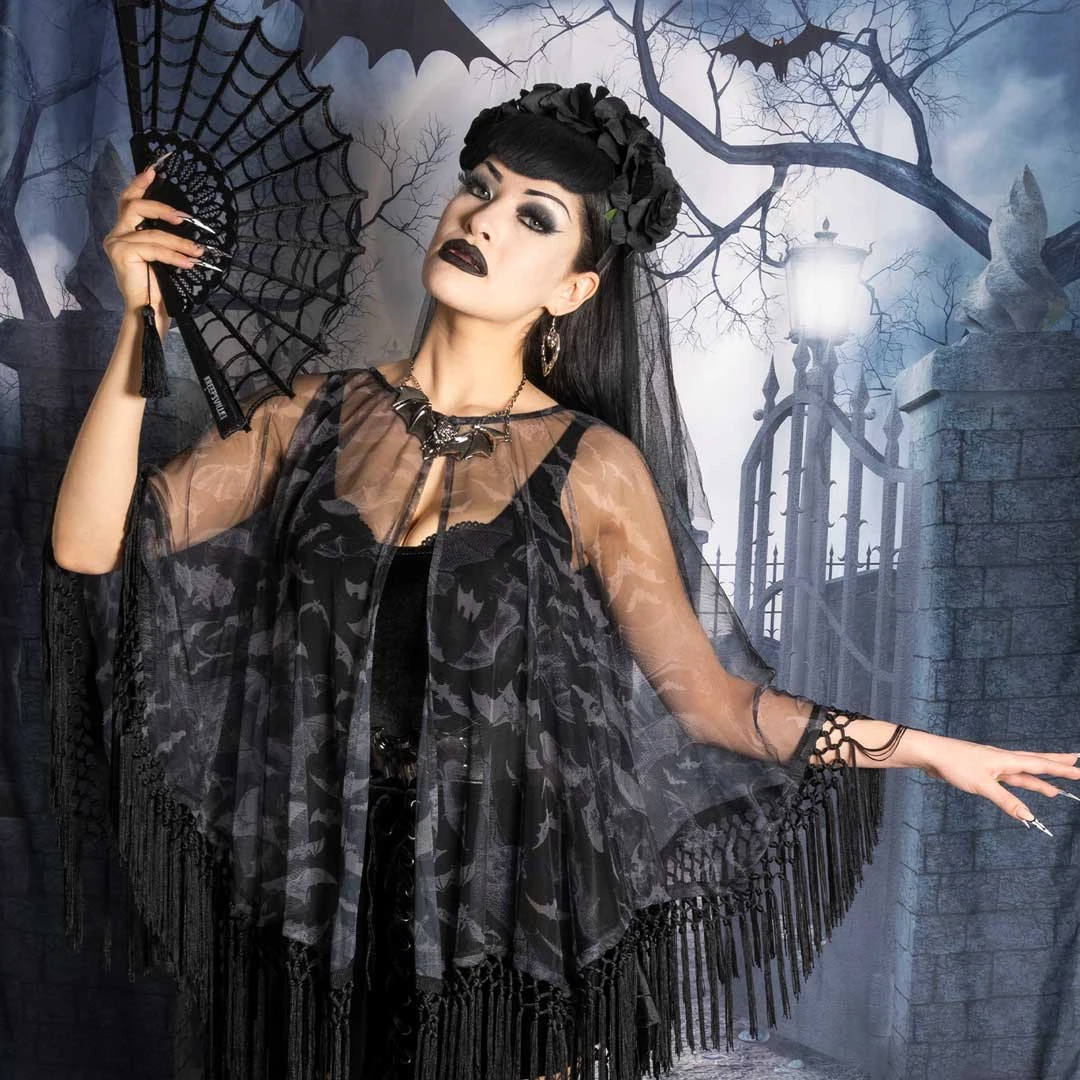 Ready to get batty? Our bat mesh cape by Kreepsville is perfect for adding a touch of gothic glamour to your look! The gorgeous repeat bat print on poly mesh is perfect for making a statement, while the crochet fringe flows beautifully in the wind. Whether you’re wearing it over your favorite dress, covering up at the beach, or just throwing it on with jeans and a tee, this cape is sure to turn heads. Featuring a hook and eye closure on the neck.