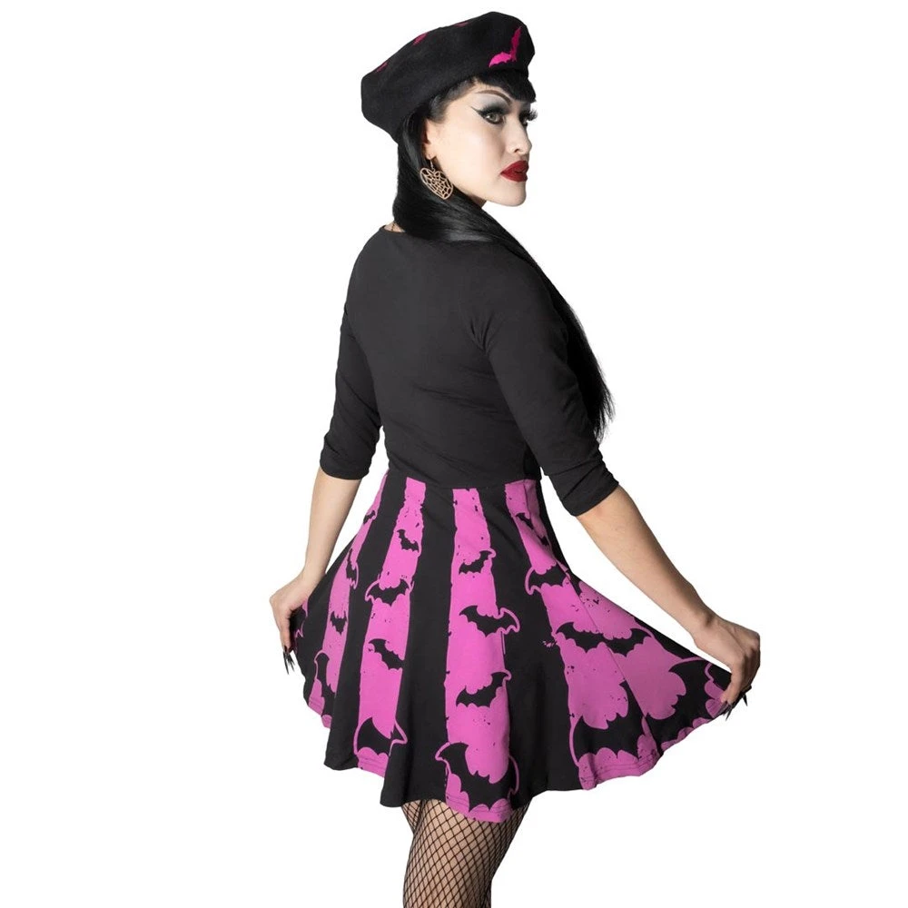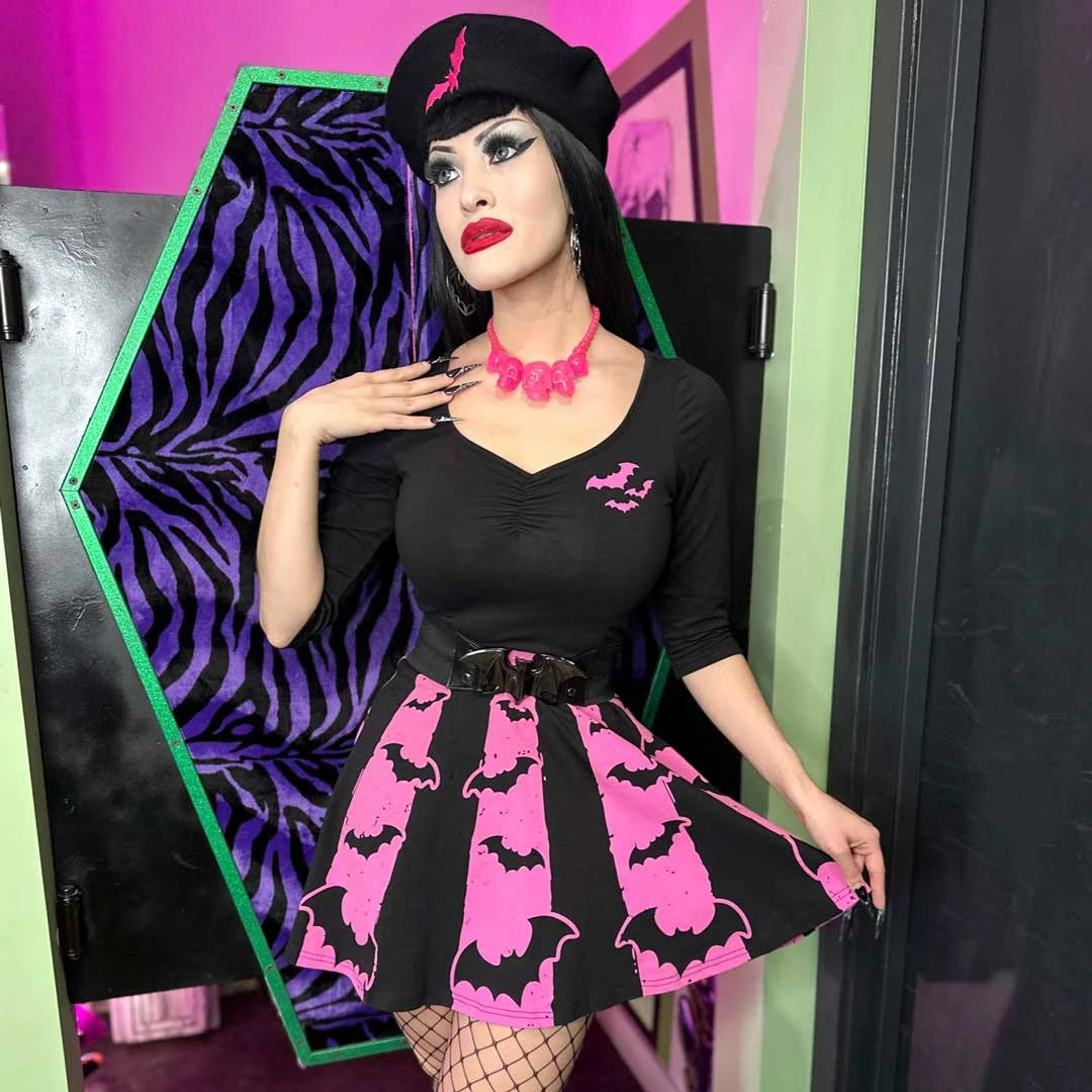 Step into the darkness and unleash your inner vamp with Kreepsville’s Bat Stripe Pink Skater Dress. This batty dress features a small bat flock print on the chest and your very own bat colony flying around bottom on top of black and pink stripes. Crafted of 95% cotton and 5% spandex blend, this dress is lightweight, comfortable, and perfect for any occasion. The flattering skater-style silhouette drapes gracefully over your curves, and the 3/4 sleeve detail and scoop neck with rouging ensure you look your best no matter where you go. Accessorize it with one of our waist belts for a spooktacular, head-turning look. Designed in California.