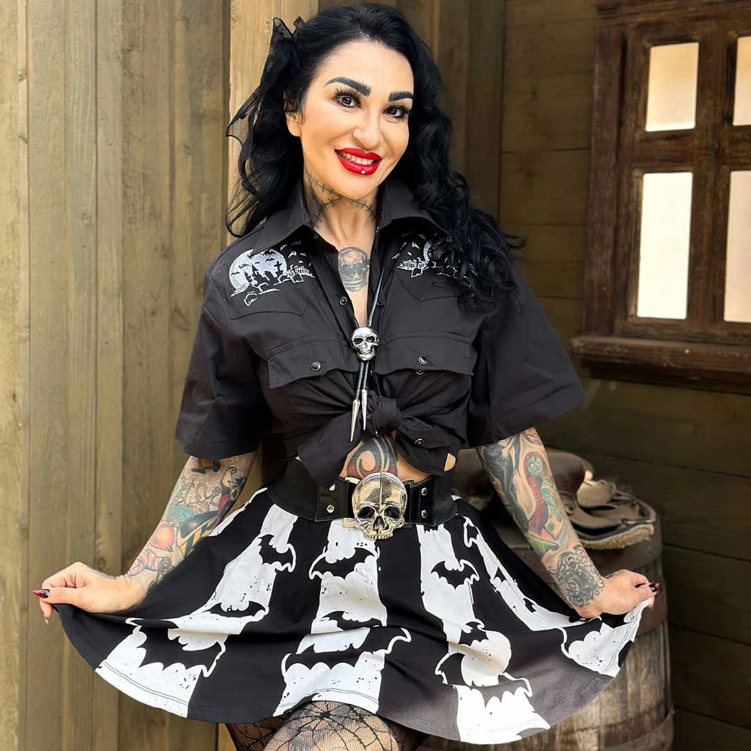 Unleash your inner vampire queen with Kreepsville’s Bat Stripe White Skater Skirt! This skirt features a bat flock flying on top of black and white stripes for a dark gothic appeal. The flattering flared shape with wide elastic waistband make this skirt comfortable and easy to wear for any occasion. Soft feel discharge print made of 95% cotton and 5% spandex. Designed in California.