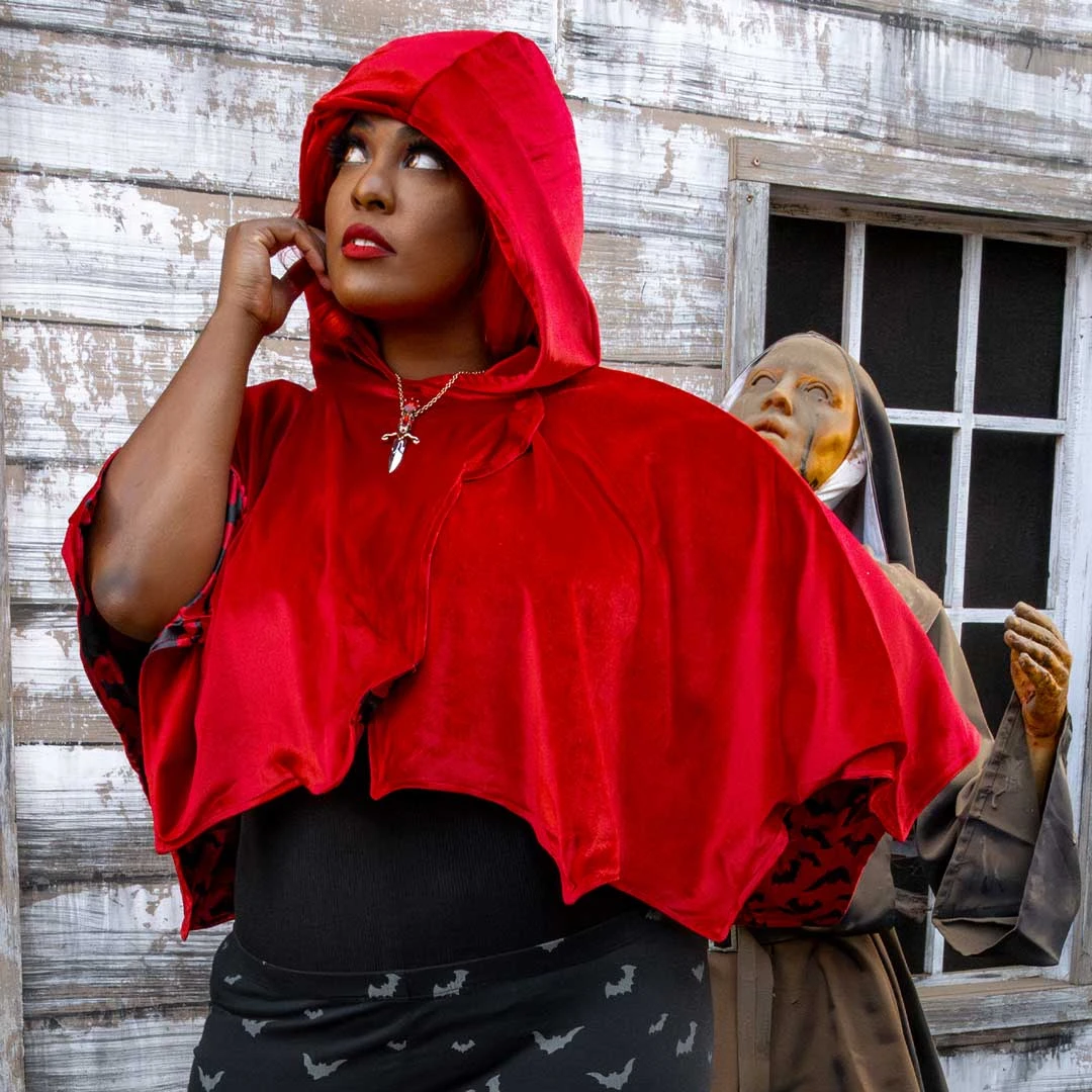 Bring red hot sinister style to any look with Kreepsville’s Bat Wing Velvet Red Short Cape. This velvety soft cape has it all: a cropped bat wing shape, red bat satin lining, soft hood to creep warm, and front double snap closure. Fend of the cold season while keeping your spooky style. Designed in California.