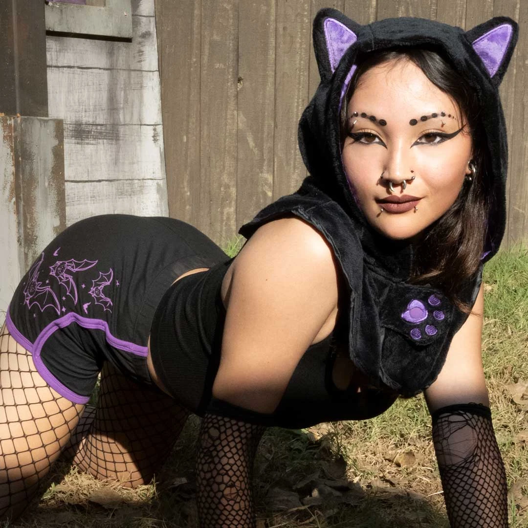 Add some cattitude to your look with Kreepsville Black Cat Horror Hood, designed to creep you warm and cozy all year long. Made from a velvety faux fur, complete with plush kitty ears, and a satin lining so your hair won’t get damaged. The perfect accessory for a halloween costume or a statement piece to complete a cat lovers look. Fear not the cold winds, with its cat’s paw neck band and snap closures, this hood fits all head sizes and will stay secure and comfortable. Designed in California.