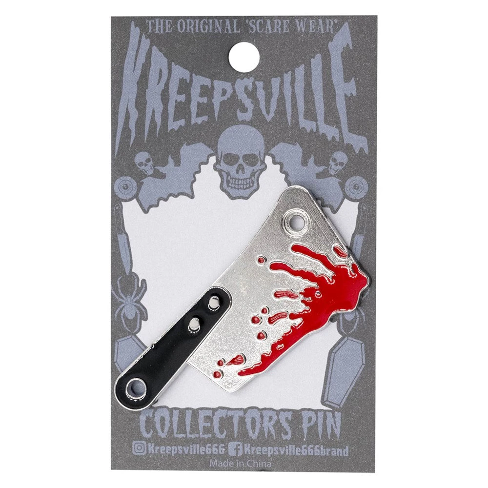 Looking for a killer addition to your gothic pin collection? Kreepsville’s Cleaver Enamel pin features sinister red blood splatter detailing for cutting edge style. Approx 2.25″ H (5.72cm) x 1″ W (2.54cm). Designed in California.