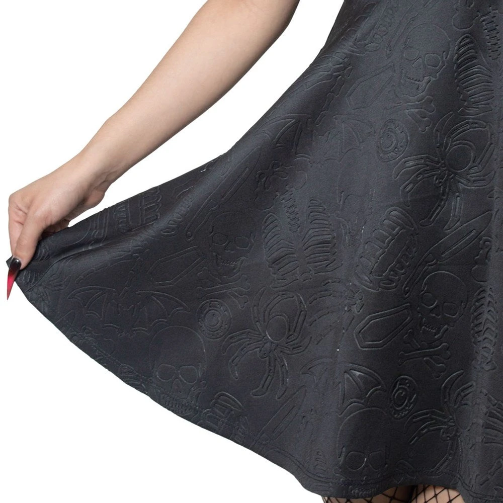 Looking to make a statement with a spooky alternative piece? Or maybe you’d prefer a more subtle gothic look? Our Death Repeat embossed skater dress by Kreepsville is the perfect combination of both! Its flattering top half with a scoop neckline hugs any body type beautifully while its flowy bottom half gives you the most comfortable look! It features a subtle yet eye-catching signature Kreepsville’s Death Repeat embossed design in the fabric featuring bats, skeletons, eyeballs and coffins! Dress is 100% polyester, pairs perfectly with out elastic waist belt (belt not included). designed in USA.