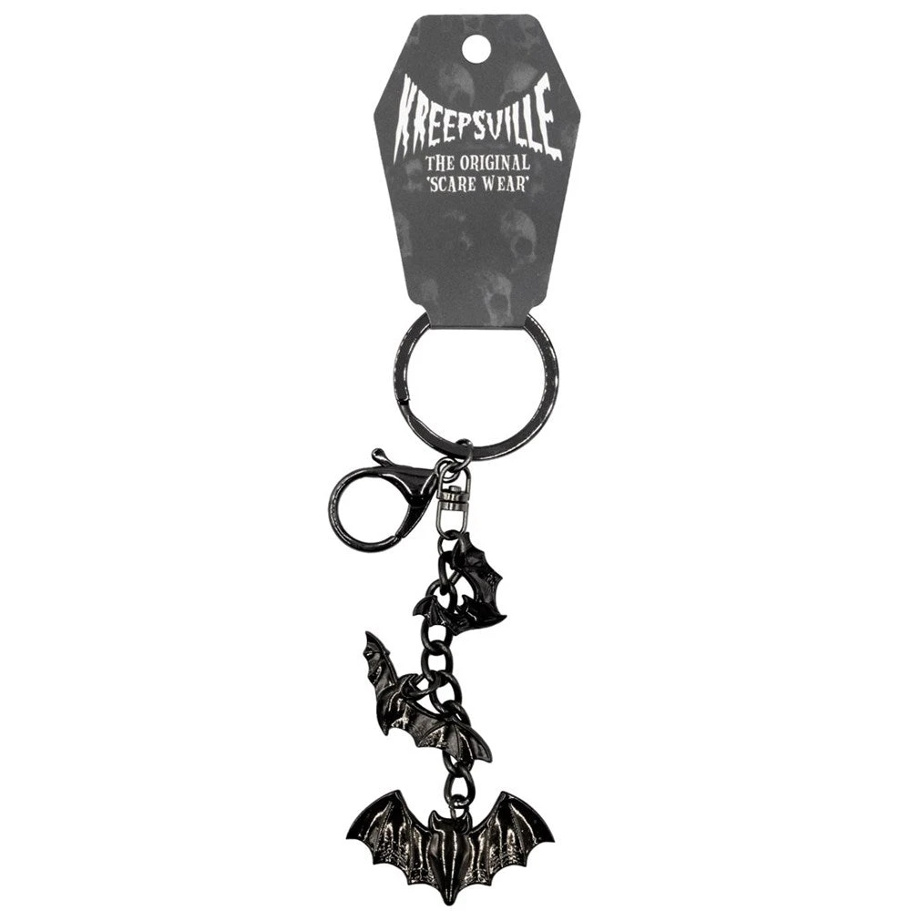 Take your keys out on a night flight with the Flying Bats Charm Keychain by Kreepsville. These three deadly-cute bats, hanging on a 2.5″ chain, are made from black alloy metal ensuring durability. Charms are attached to a 1.5″ split key ring with clip for easy attachment to your keys or perfect charm accessory for your bag. Keychain is approx. 6″ (15.2cm) long including key ring.