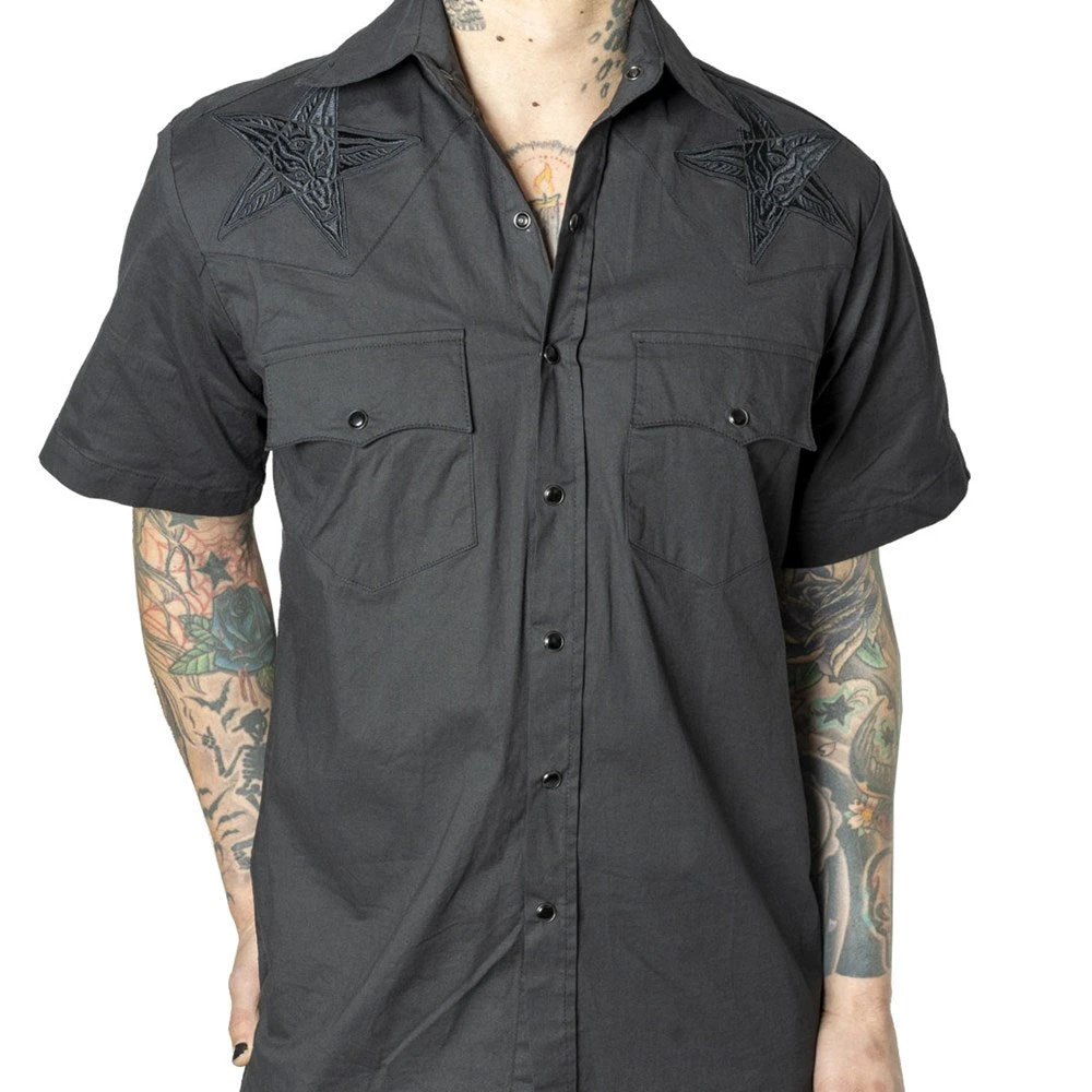 Show you allegiance to the dark side with the Kreepsville Red Hellbilly Baphomet Western Shirt! This gothic western essential has been embellished with a darker, edgier style thanks to a black trim and embroidered baphomet on the front and back. Crafted from a cotton poly blend fabric with short sleeve detail for maximum comfort and breathability, this shirt is detailed with black snap buttons for an extra dose of spooky style. It’s the perfect closet addition to any gothic western wardrobe or a touch of edgy rock ‘n’ roll!
