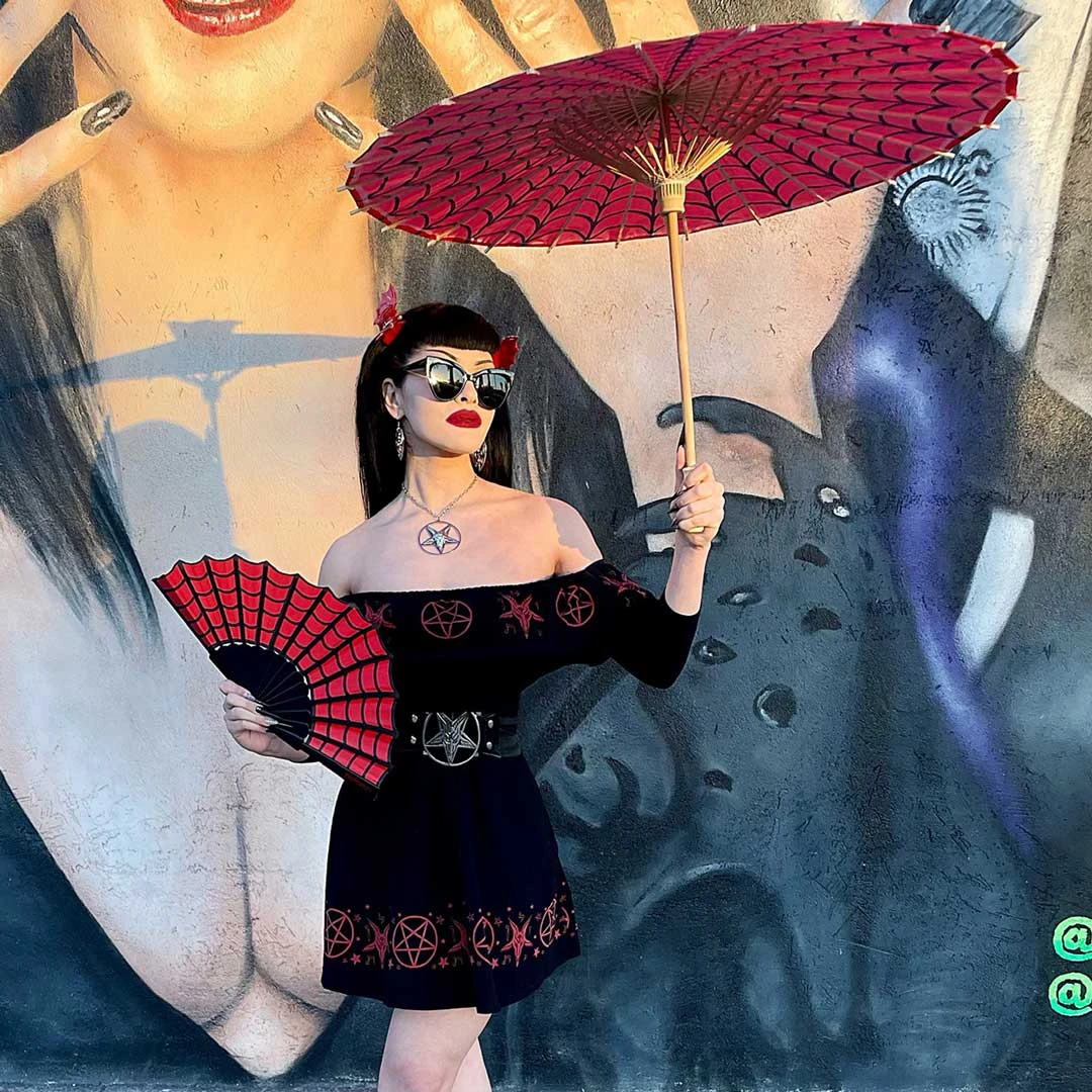 The Satanic Circle Ruffle Dress by Kreepsville 666 is the perfect way to add a touch of Devilish style to your wardrobe! This fun and flirty dress features a pattern of red Baphomets and inverted pentagrams front and back, adding a bit of edge to your look while its flowy skater skirt bottom and non-slip off shoulder ruffle top with ? sleeves is perfect for feeling like a flaming hot devil on a night out. Made from super soft 95% cotton and 5% spandex, this dress is sure to keep you comfortable all day or night. Made in the USA.
