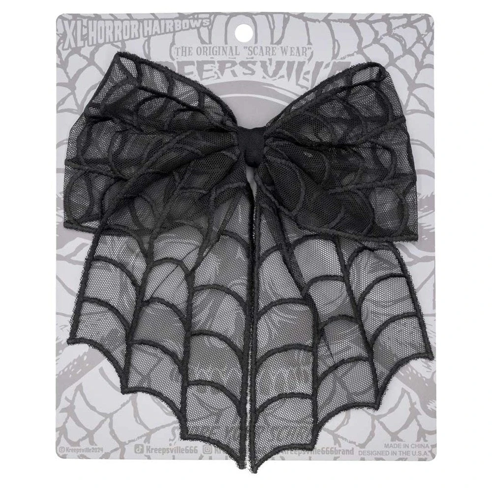 Coquette has gone goth with the Spiderweb Lace Hair Bow by Kreepsville. This extra large bow is made with an intricately embroidered spiderweb lace that will bring a touch of classic gothic glamour to any hairstyle. Fastened with a large sturdy metal barrette, this bow will stay spooky and secure from dusk till dawn. Pair with our matching Spiderweb lace parasol and fan for an eerily elegant look. Clip length approx 2.5″ (6.3 cm), bow size approx 6.75″ (17 cm) x 8.75″ (22 cm). Designed in California.