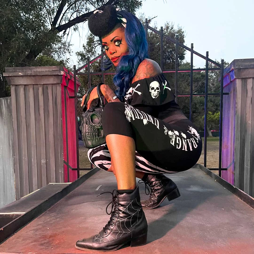 Be the ghost with the most babe with this Kreepsville Strange And Unusual stripe capri leggings! These capri-style leggings are the perfect mix of spooky and chic, it will show off your curves in all the right ways. With a bone white stripe down one leg and Strange and Unusual text on the other, these leggings are sure to turn heads no matter where you go. Made out of super soft 95% cotton and 5% spandex, its elastic waistband makes these leggings comfortable enough to wear all day long! Made in the USA.